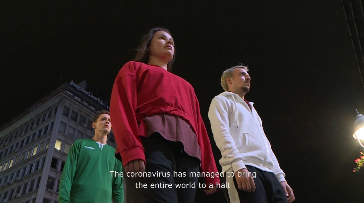 I was inspired by the thoughts on pandemic, disaster-capitalism, body-politics, and care by P. B. Preciado, Pavle Levi, Sylvia Federici and Naoimi Klein, and by the various statements I collected from everyday speech of my friends, lovers, cousins, neighbours and social media. I connected these verbal, theoretical and poetic observations with body movements. The dancers I worked with faced the difficulties of dancing in the public space and doing contact improvisation because of constant changes of the measures of social and corporal distancing. The expressive narration in the video culminates in a choreographed movement “knee-on-neck”. The repression of the ruling structures raises the question of whether the immunised society, which is now being sought, represents a danger to the survival of art, sociability and even human beings.