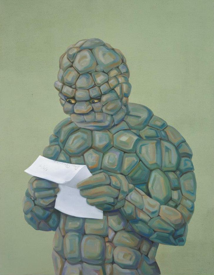 Following a period of much success, Eisenman confronted the psychological trials of being an emerging artist as in the 2004 work From Success to Obscurity. Here, the Marvel Comics’ Thing is renamed ‘Obscurity’, and is a stand-in for the artist. No longer tough, poor ‘Obscurity’ hunches over a letter from a sender ‘Success’. No matter how thick-skinned the famed green monster might have become, ‘Obscurity’, with a quivering lower lip, looks hurt.