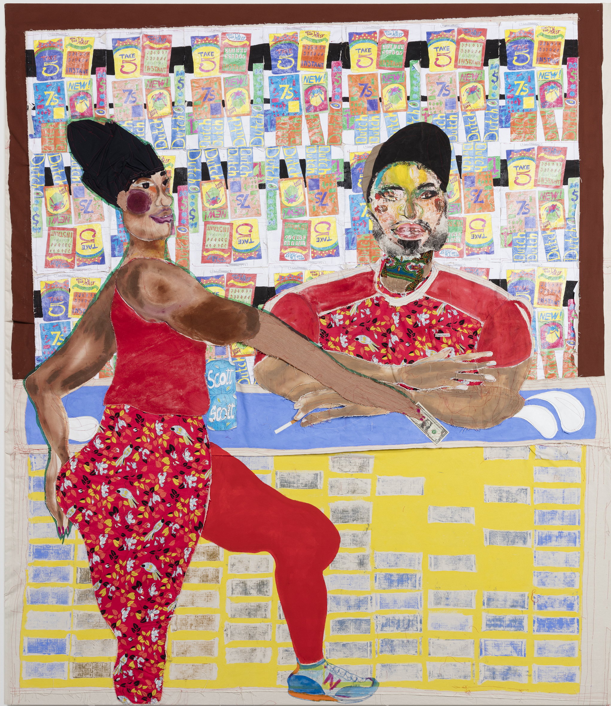 depicts black figures, often female, in a bold, exaggerated and flattened style with a combination of sewn, printed, and painted materials. She learned quilt making and sewing from maternal family members and uses these assemblage and appliqué techniques to confront the stereotypical and sexualized representation of black bodies, referencing Jacob Lawrence and Faith Ringgold as artistic touchstones. Working with fabric scraps, she prefers ‘materials that are of the world because they keep that energy from their original purpose’.