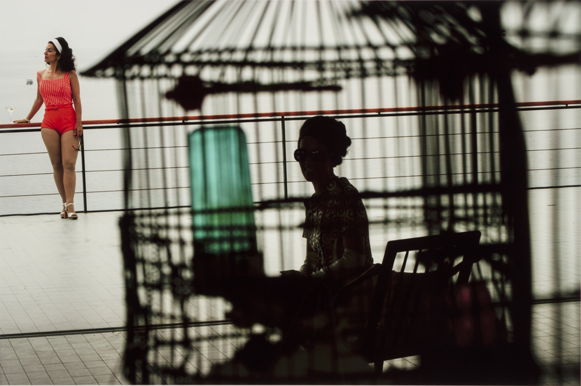 Director Eve Sussman (b. 1961) and her collaborative team Rufus Corporation reimagined a well-known story, Romulus’s founding of ancient Rome, in their eighty-minute video The Rape of the Sabine Women (2005), set in an idealised 1960s. The video’s sumptuous shots are reflected in the sleek and evocative photographic stills produced by the team. An image of Greek actress Themis Bazaka seated on the deck of the modernist Lanaras House near Athens illuminates the artists’ meticulous design and staging processes.