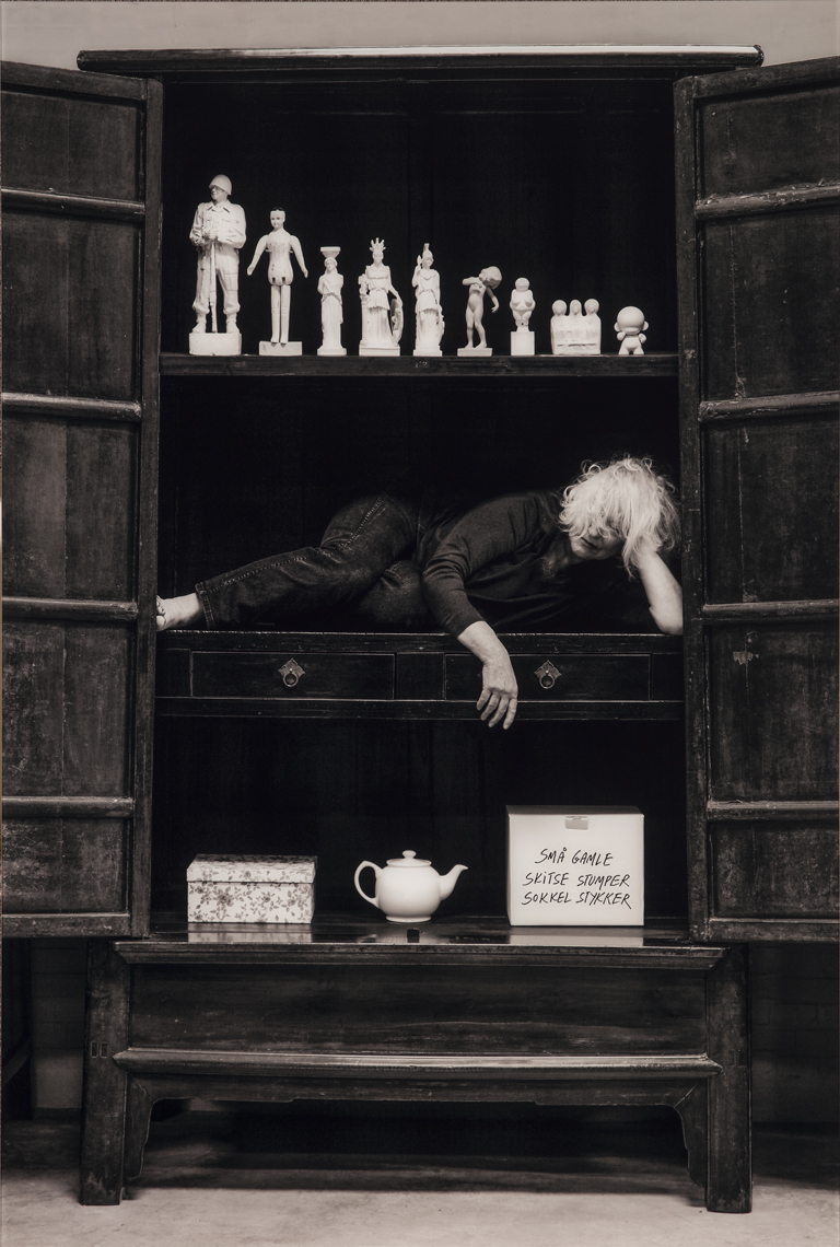A pioneer of body art, Kirsten Justesen (b. 1943) frequently photographs her own body to explore its relation to space and language. Her performances typically take place outdoors, but to make a recent self-portrait, she tucked herself into the shelf of a wardrobe above a box marked ‘old bits of little sketches,’ keeping her ideas for future projects close at hand.