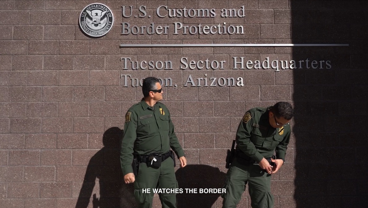 The artist weaves together excerpts from the film Geronimo Jones (1970) with drone and surveillance-like imagery of the landscape, drug smuggling routes and an affectless recitation of phrases taken from A Practical Spanish Grammar for Border Patrol Officers, the language of power that defines and controls the border gates.