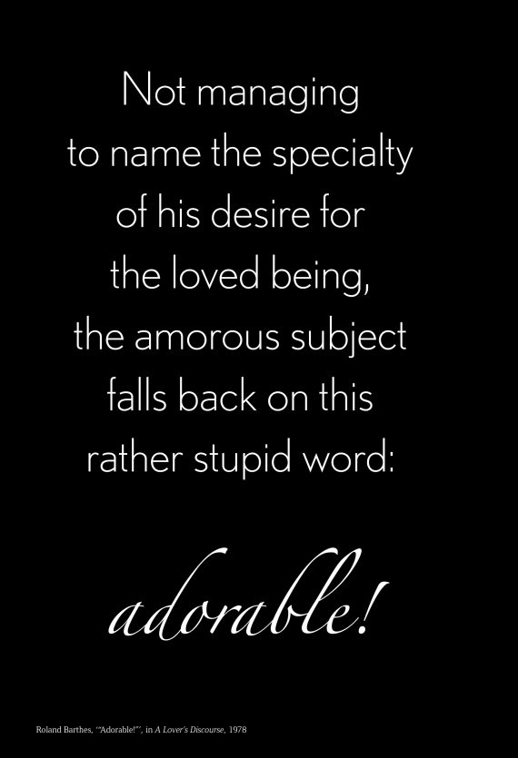 If the zany is visually omnipresent but evaluatively recessed in contemporary capitalist culture, and the interesting is evaluatively strong but formally weak, the cute is striking for its symmetrical and increasing strength on both fronts. So on the one hand, cuteness refers to the ‘look’ of objects that come across to us as appealingly powerless – soft, malleable, diminutive – which is why its paradigmatic object is still the plush toy or Kuscheltier. (The German noun serves us better here, because in contrast to the comparatively cold-blooded ‘stuffed animal’, it contains an explicit reference to the act of snuggling.) On the other hand, ‘cute’ is also an aesthetic judgment. It is the thing we say to others, in a tellingly specific way often involving a cooing voice, a childish diction, and unconscious shrinking of one’s body, in spontaneous response to our perception of an object’s form as soft, malleable, diminutive, and so on. Directed as much if not more to an imaginary public of other subjects standing apart from the object itself, this affective response, ‘Cuuuuuuute!!’ – or as Roland Barthes prefers, ‘Adorable!’ – is also an evaluation: one that seems primarily positive but that is ultimately ambivalent. Calling something or someone ‘cute’ can be as much of a dismissal as a compliment.