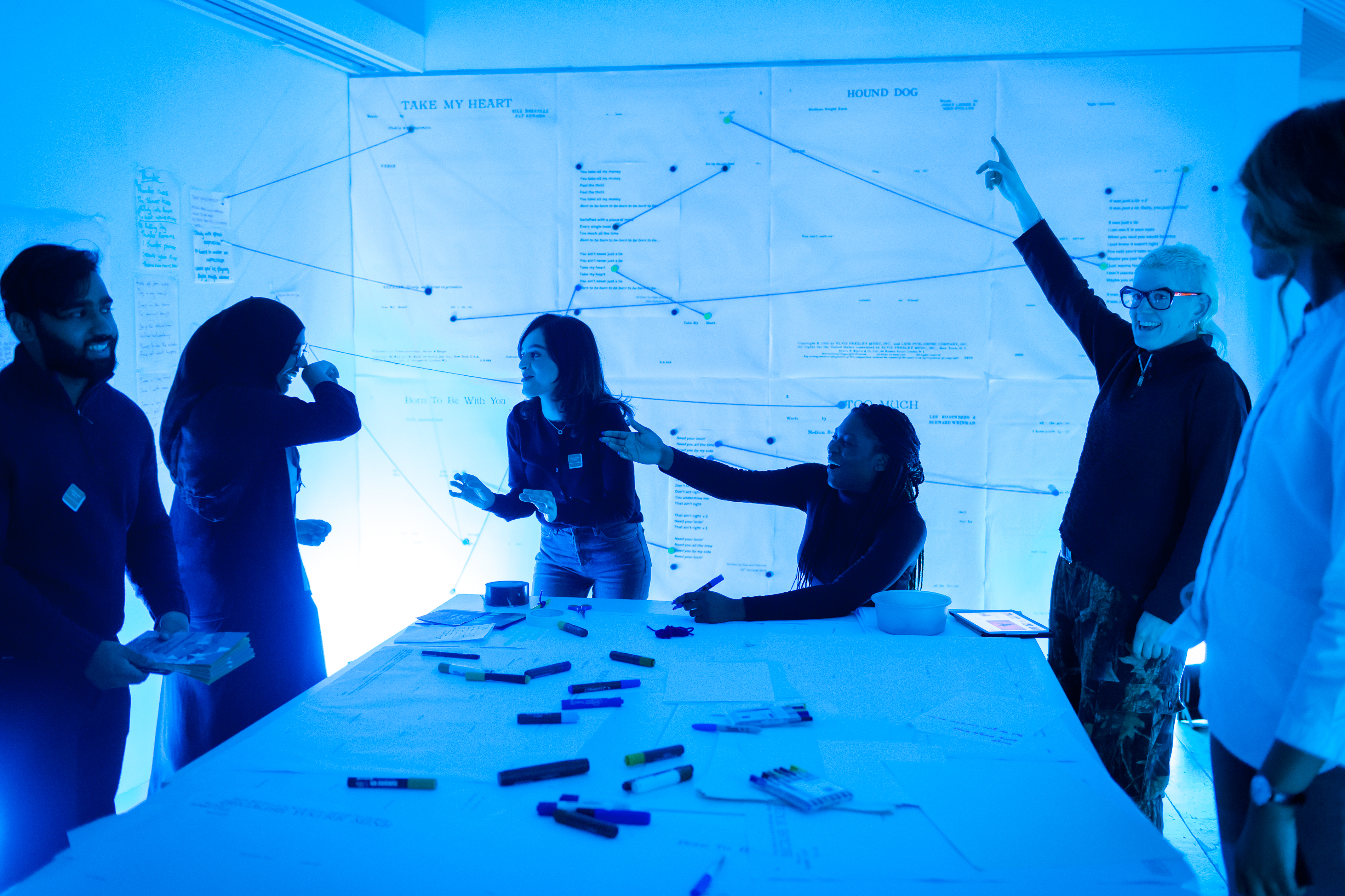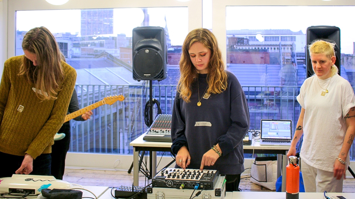 The idea for our project was to explore collaborative music making. A playlist of out-of-copyright material available on Open Music Archive triggered great moments of collective listening – as did the exhibition Once Heard Before and the sharing of our own favourite songs. Layering, looping, reversing, reordering and sampling quickly turned into tools to compose new beats digitally. Rosie’s work inspired our field recordings, vocalisations, and sonic experiments. The lyrics drew on newspaper headlines and songs that talk about gentrification, voting rights, having a voice, and the rush of new love. Making things together can be a challenging process but mutual support, a bit of humour and a great deal of crisps and Haribo Starmix helped us getting get there. Ahead of the EP recording and launch last year, we presented a sonic installation and live music production takeover at Whitechapel Gallery. This became a testbed for collaborations with guests and a platform for spontaneous performances and new compositions.