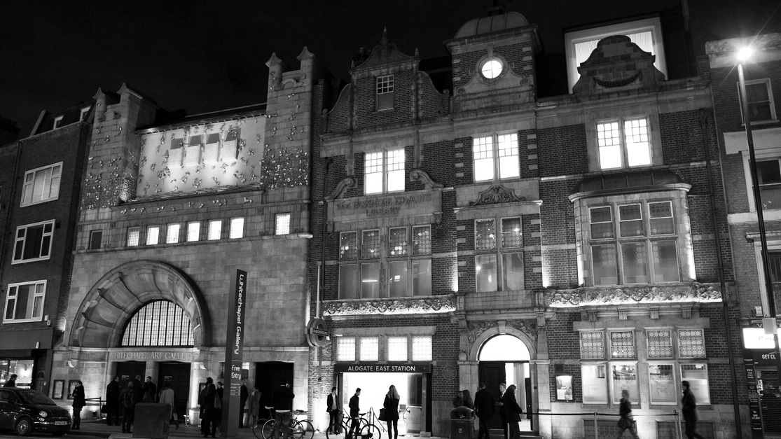CABARET KULTURA > Whitechapel Gallery at night – Photo Marcus Dawes 1 b&w