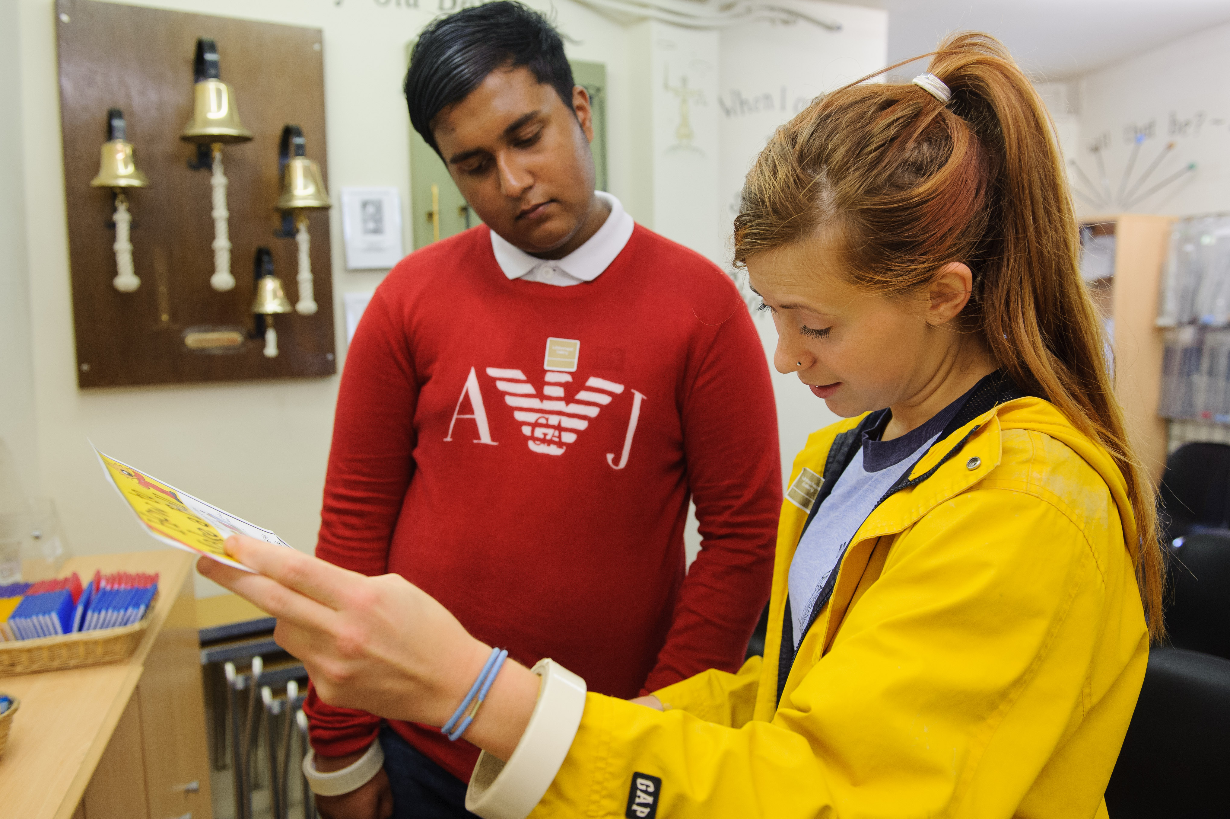 A young person in a yellow raincoat & long hair standing next to a young person wearing a red jumper. They are concentrating on a document, a map, an artwork, or instructions.