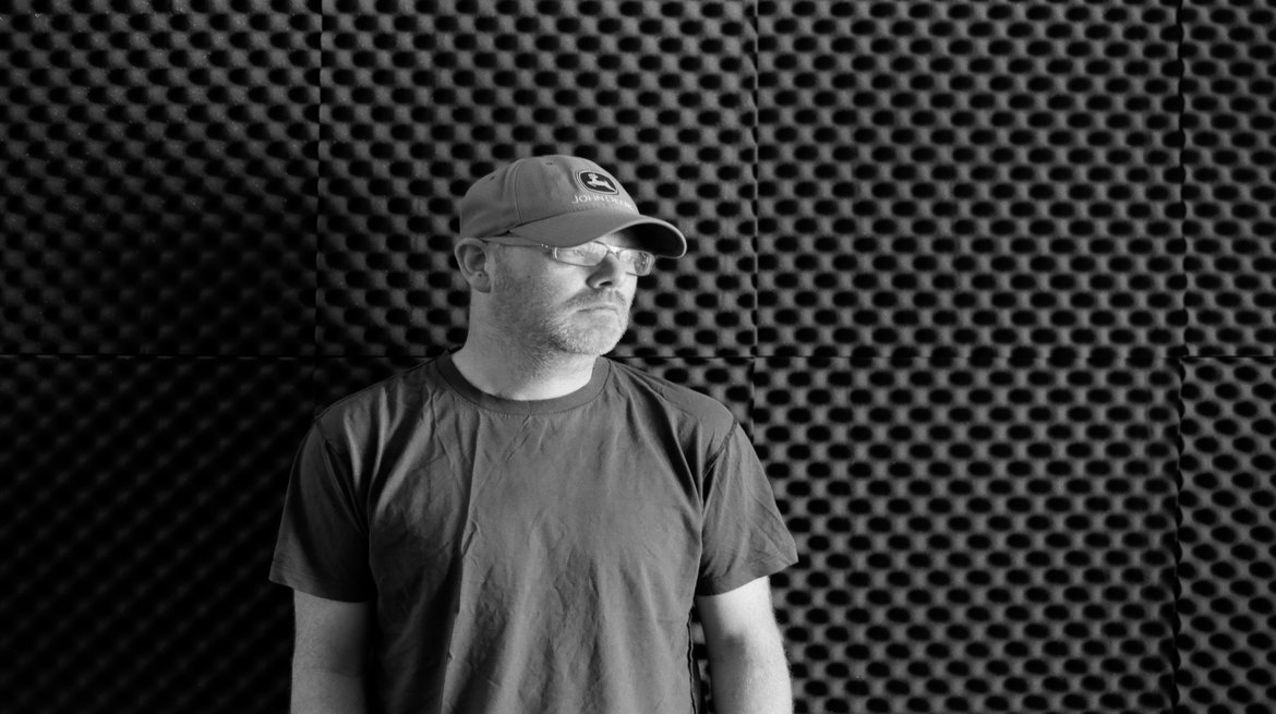 Black and White photograph of artist Mark Fell: a man with facial hair, glasses, and a baseball cap wearing a plain tshirt against a textured backdrop.