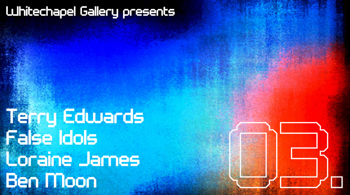 The third in a series of experimental sound nights. Bringing together explosive colour visuals, jazz and electronic dance music, Terry Edwards, False Idols, Loraine James and Ben Moon present new sound from inside the Gallery’s Foyer.