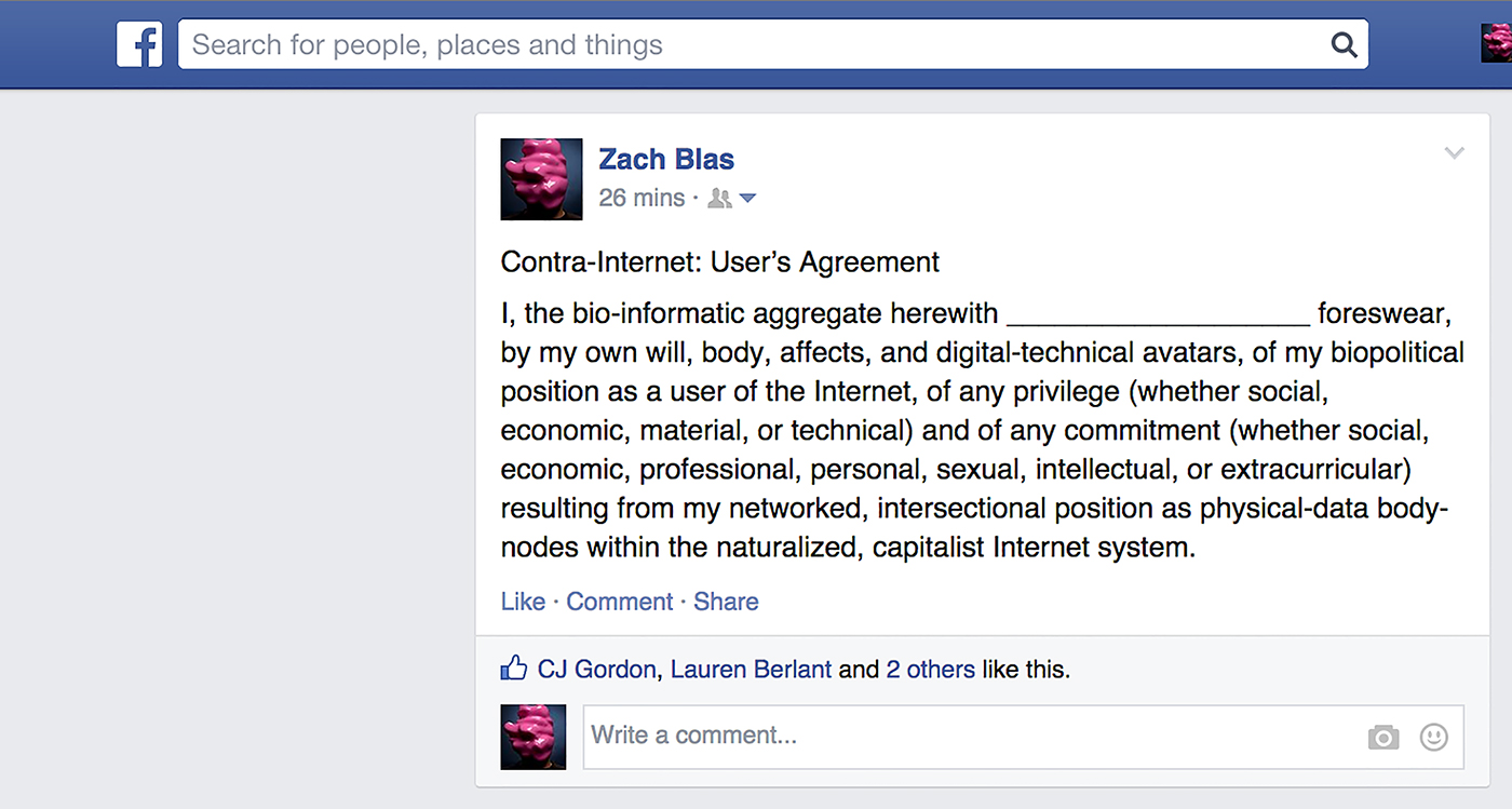 Zach Blas: Contra-internet > Zach Blas, Facebook, 2015, courtesy the artist