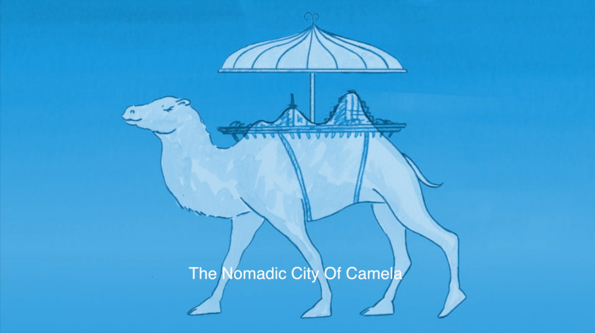 Luis Lázaro Matos’ (b. 1987, Portugal) animation The Nomadic City of Camela (2017) is based on his short story about a mobile city built on the three humps of a camel. The city has been conceived in great detail by its urban planners to preserve the precarious symbiosis between the city and camel, and between its citizens.
