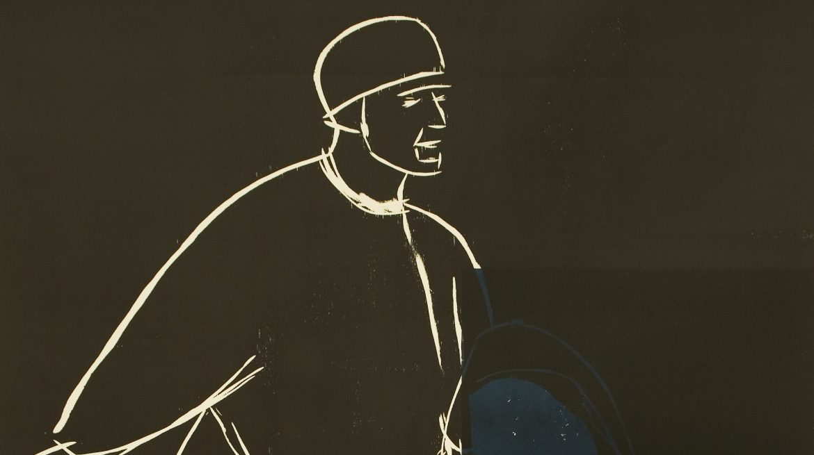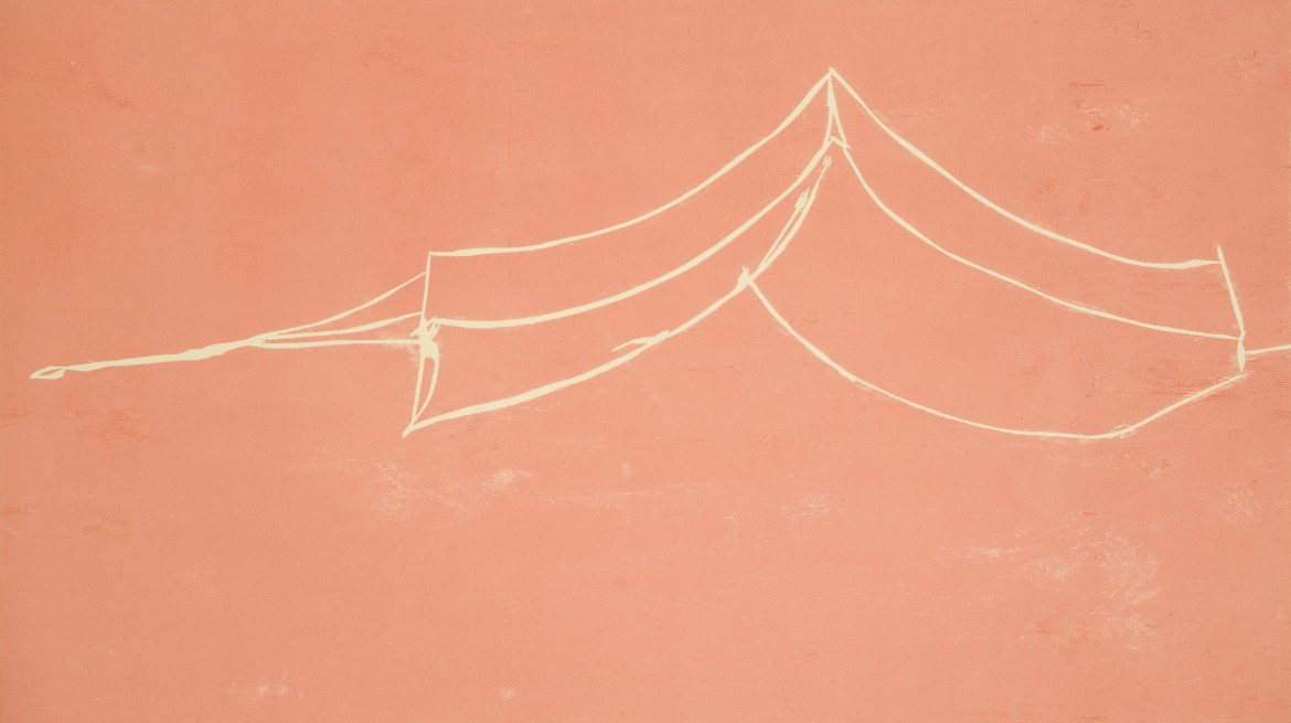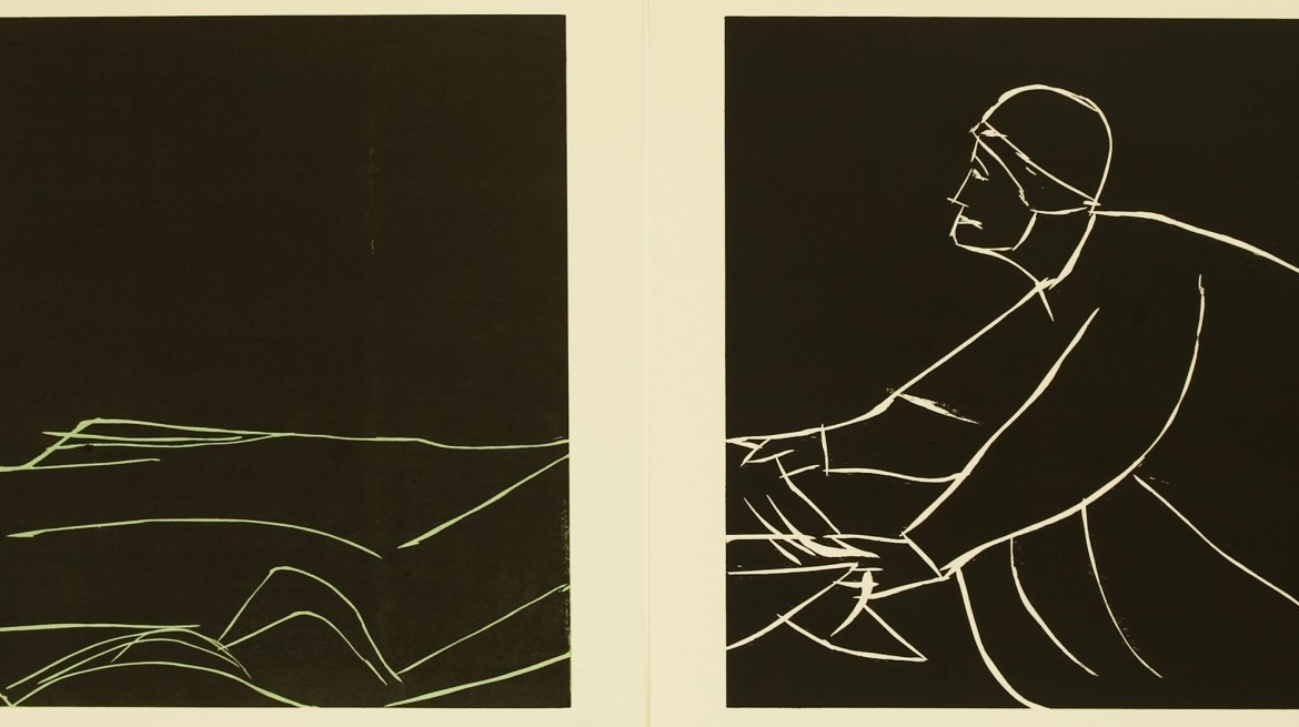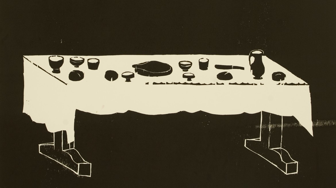 In her exhibition, Büttner presented work made from simple materials with traditional techniques and imagery including woodcuts depicting Christian iconography. Alongside this traditional imagery, everyday textiles from the uniforms of park wardens, policemen and refuse collectors created colourful ‘paintings’ that formed part of the artist’s exploration of the symbolic use of fabric in both Italian religious art as well as in its contemporary secular forms.