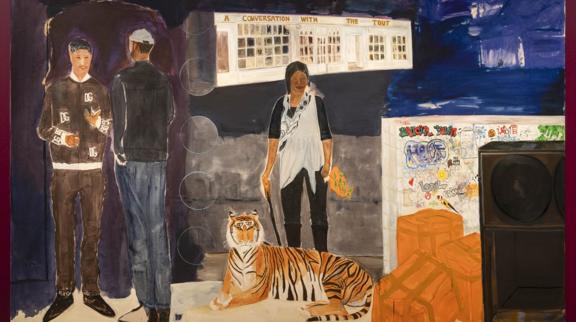 Presented here are a sound composition, a film shot in the streets surrounding Whitechapel Gallery, a series of six new oil paintings, a site-specific mural and a bamboo sculpture. The sound composition, which can be felt physically through a speaker system embedded in a seating structure, forms the soundtrack for the film. This features three dancers who navigate the gallery and surrounding streets, interpreting the area through their movements.