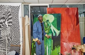 Andrew Pierre Hart in his studio surrounded by colourful paintings