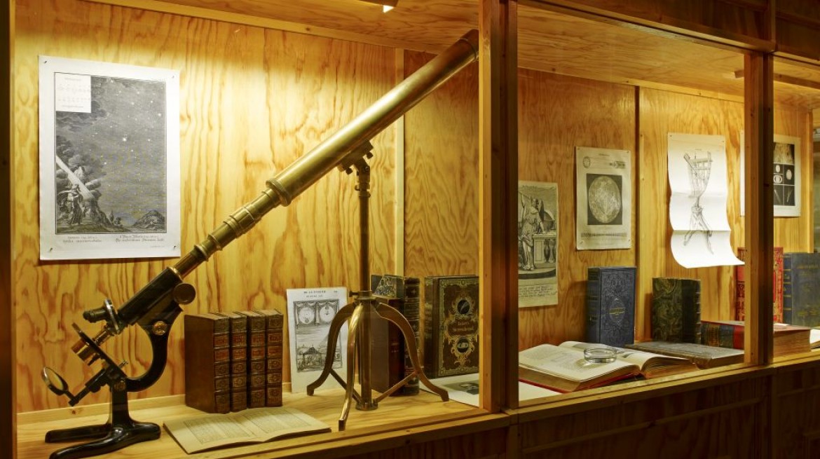 A towering structure fills the lofty spaces, with seemingly endless shelves filled with centuries of accumulated human knowledge. Through the spaces between books and artefacts lies an inner sanctum, a warmly-lit cabinet of curiosities. Above, a vast mirror reflects a horizontal beam of light, transforming it into the rungs of a ladder to infinity.