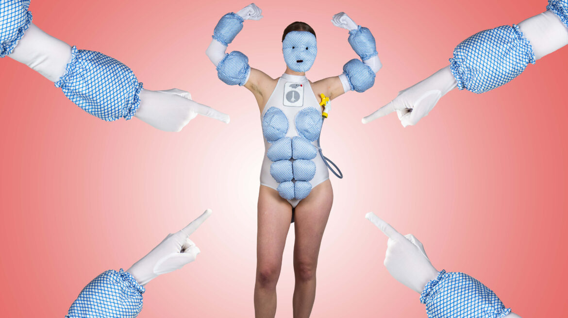 The New Me by Rosie Gibbens centres around an absurd, dystopian retro-futurist vision of consumerism, in which a corporation called ‘Ilium’ manufactures and markets pointless products to bored consumers. The New Me consists of three video works, each a surreal advertisement for a ‘life enhancing’ Ilium product. Ultimately, these products operate as self-parody as they fail in their promise to increase efficiency, enable multi-tasking and optimise the body. Embracing absurd humour, Gibbens explores the slippery overlaps between identity, labour and consumer desire.
