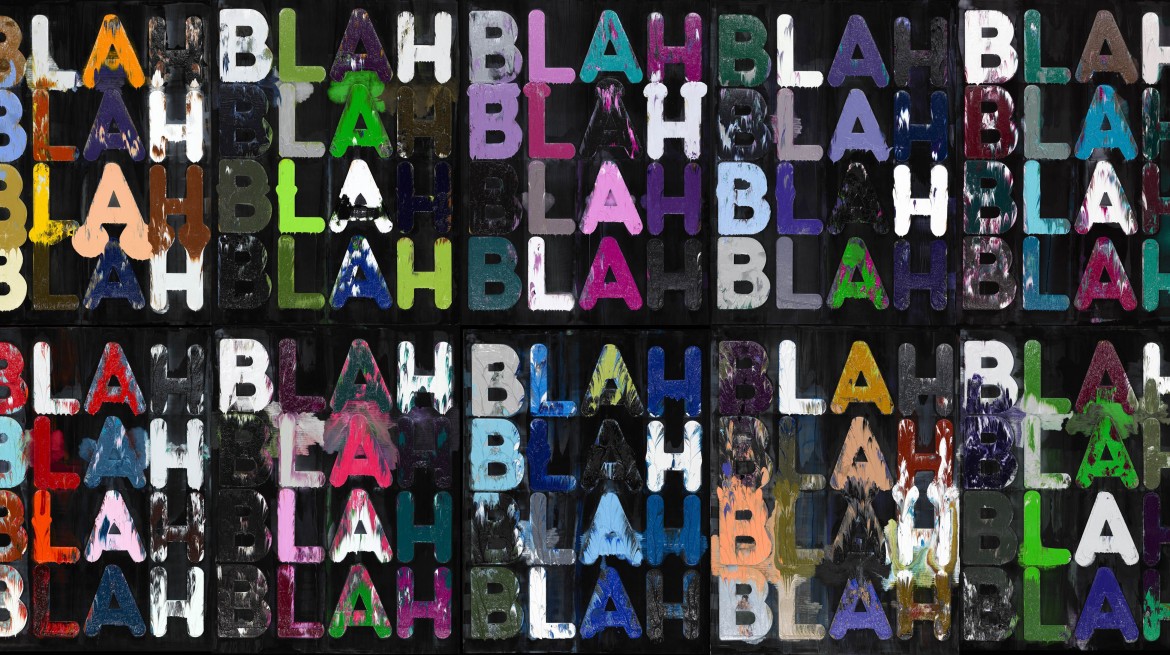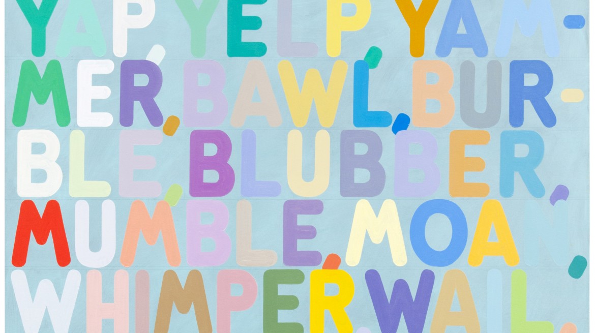 Descending from phrases such as ‘top dog’ and ‘king of the hill’ into macho mantras such as ‘rule with an iron hand’, the latest paintings of American artist Mel Bochner (b. 1940) use a thesaurus to generate word chains that are both mordantly funny and bursting with colour.