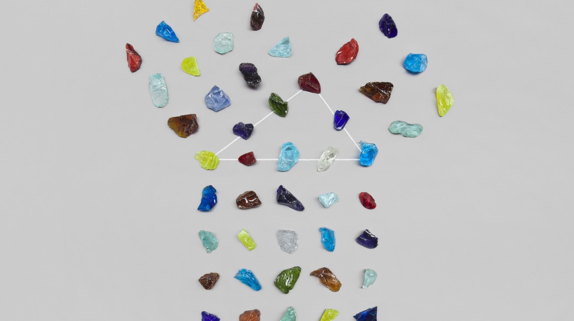 In a reprise of Marcel Duchamp’s painting Nude Descending a Staircase, a scattering of 48 inch lines occupies the Gallery staircase. At the top No Thought Exists Without A Sustaining Support (1970), is chalked onto a blackboard that appears to drip down the wall. Exuberant planes of colour leap across the walls of Gallery 9 with Two Planar Arcs (1977) and a sculpture made in vividly chromatic chunks of raw glass.
