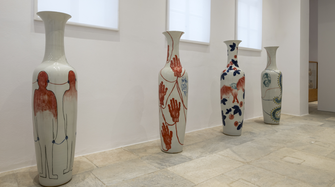 In another wing of the museum the towering porcelain vessels of Barthélémy Toguo use delicate glazes to depict the deathly iconography of the virus in African society. Opposite hang self-portraits screened on Ghanaian textiles by Zohra Opoku her image metamorphosing from her botanical environment. Where the museum offers a retirement home for the vessels of antiquity, Petrit Halilaj brings fragments of Neolithic pottery back to life by turning them into birds for whom he has constructed two nests. Elsewhere he has installed the museum conservationist’s deadliest enemy – a giant moth is suspended from the museum’s ceiling, a metaphor for all those who can only reveal themselves under cover of night.