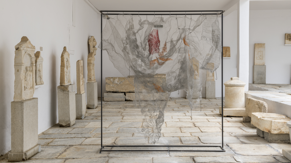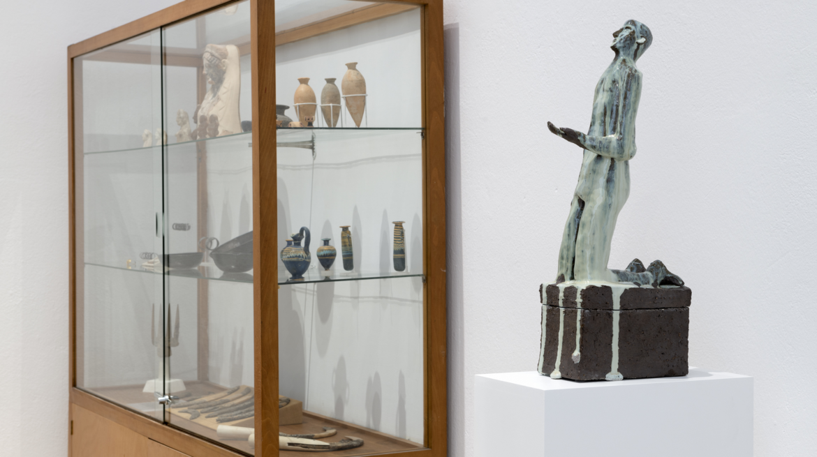 The work of 13 artists is juxtaposed with the Archaeological Museum of Mykonos’ collection and additional treasures selected by the archaeologists of the Ephorate of Cyclades. Like a theatre curtain a monumental decorative drape newly commissioned from by Duro Olowu, which combines the richly decorated textiles from northern and southern hemispheres, provides the overture to the exhibition. An installation of artefacts – both platonic and erotic – has been composed by Haris Epaminonda. Simone Fattal presents her haiku-like ceramics evoking classical ruins and monsters; while Rena Papaspyrou magically transforms contemporary detritus into archaeological fragments. Ian Law enters the hallowed confines of the museum vitrine with votive figures that incorporate the ashes of the dead.