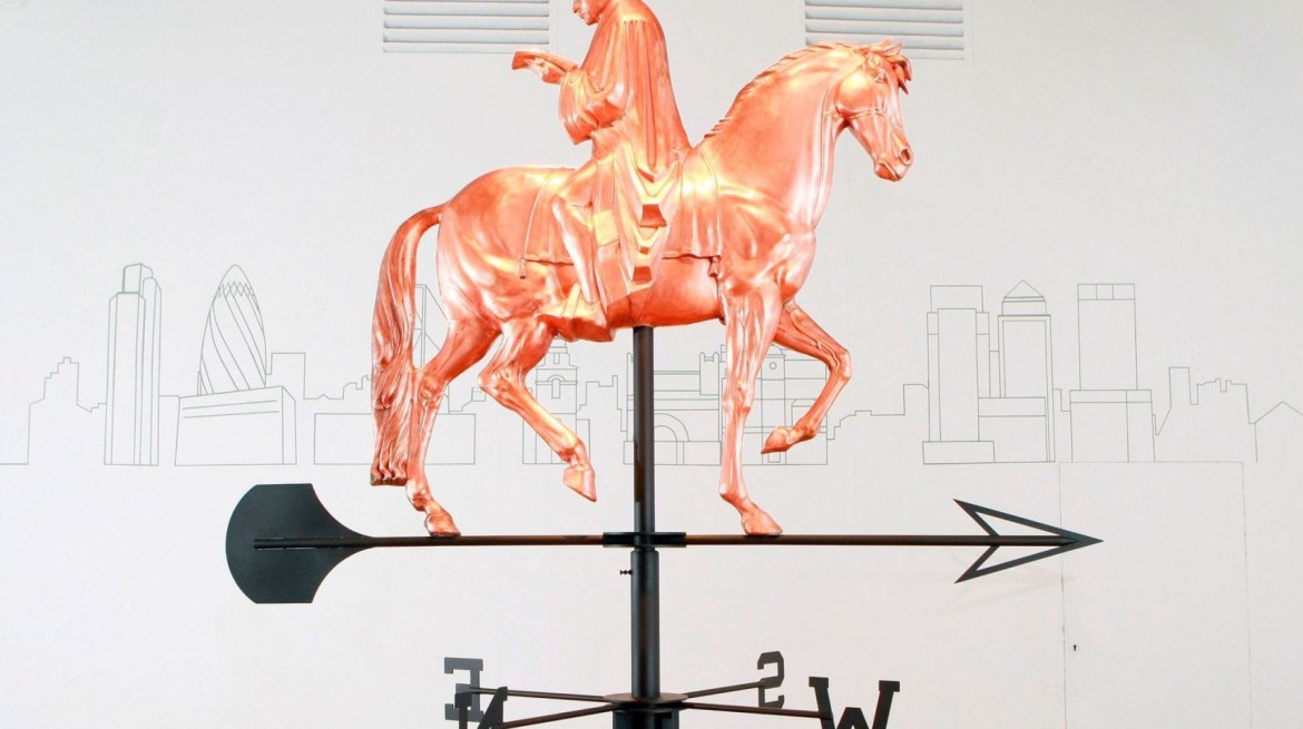 Rodney Graham’s copper and steel working Weathervane (2008) is permanently installed on the Gallery roof. It depicts the artist as the sixteenth century scholar, Erasmus, seated backwards on a horse while reading The Praise of Folly.