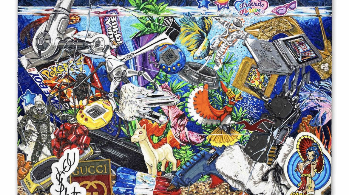 White’s tondo, square and rectangular sculptural paintings act as portals into a world of consumer excess. Instant and over-stimulating, the scenes are populated with brand logos, banal mass-produced toys, remnants of personal habits, designer goods and obsolete technology that coalesce to form a visual synthesis of our attachments and desires. By situating both mass-market and extravagant luxury items alongside one another White disrupts the prescribed hierarchies of society, status, and wealth employed in so much of contemporary culture’s presentation of lifestyle identity.