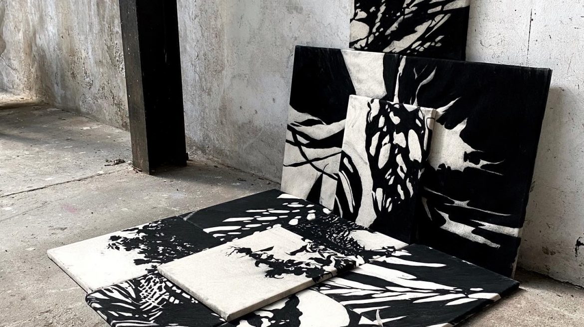The works are created in the unforgiving medium of charcoal on raw canvas. Once laid down, any mark or smudge, accident or disaster is there forever, and serves as a reminder of the artists fallibility. Often silhouettes, these images of plants and shadows are sometimes cropped and reordered so as to render their representation codified. Universal symbols of shadow slot together so as to create a labyrinthine mass that is overpowering and dystopian. Nothing is sacred and nowhere is safe.