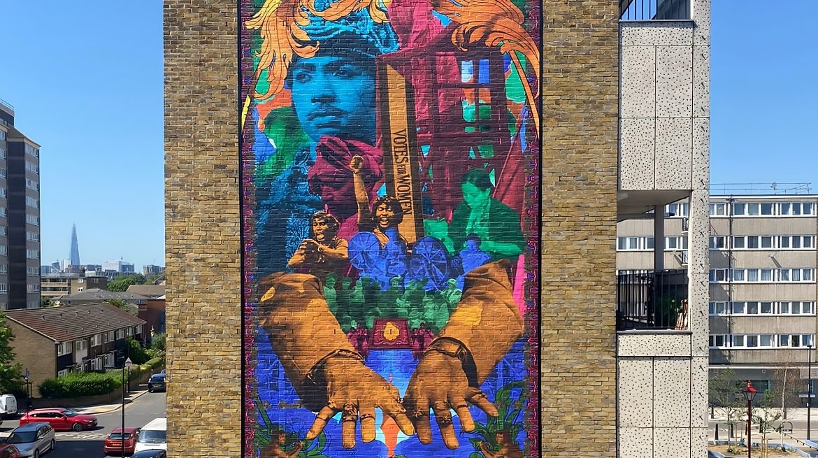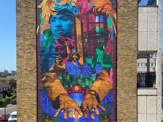 Installed on the side of Clynes House in Globe Town in July 2023, the work is a large colourful photographic collage of archival materials that speak to the rich history of Tower Hamlets and the contemporary character of the area and its residents.