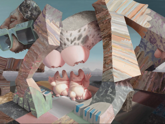Goddesses of Spoiled Lands presents such fabulous deities encased in blocky, striated marbling and set against an alien sky of an ombre pedigree. Rendered in hypnotic pastels and buttery oil paint, apparent contradictions abound within these scenes: soft and hard surfaces, male and female genitals, human and animal anatomies, megalithic stone statues to ancient gods and banal icons of the modern convenience economy (Easter Island heads, known as mo’ai by the Rapa Nui people who carved them, butt up against faded Amazon boxes in Makemake’s Voguing (2023)). Quiroz’s goddesses vogue and creep, dance and sway; they slump sassily and bend over in platform boots, emanating a queer joy of lithic liminality. Each work’s title eludicates its subject, which Quiroz pulls from global mythologies, paying particularly close attention to origin stories across cultures.