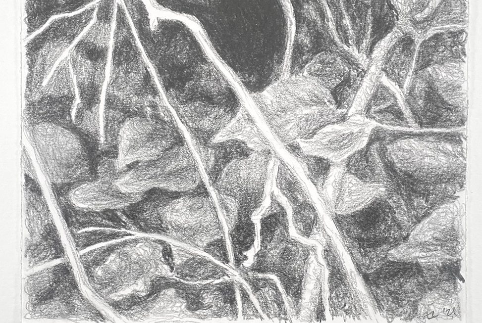 All the works in this exhibition are the result of interactions with landscape within one mile of Coop’s home in South East London. A second group of drawings depict re-imagined street scenes proposing some relief from all that is human-made. Densely layered graphite obscures traces of urbanity on a series of photographs, offering the viewer an alternative version of a ‘locality’ made distinct by the competing contrast of nature nestling within the urban.