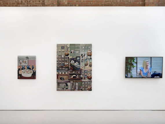 Swedish conceptual artist Jonas Lund has worked around the increasing digitalisation of culture for years, producing a body of work that investigates issues of creative labor, production, authorship, and authority within the art market and society at large. As these systems become more complex and entangled over time, Lund’s work evolves recursively, riffing off itself in confounding ways. In the Middle of Nowhere II, presented at Annka Kultys Gallery in London, picks up where In the Middle of Nowhere, exhibited earlier this year at Office Impart in Berlin, left off. This iteration drops us into the speculative office of an aspirational CEO whose unnamed company, much like the Yarner-equipped ghostwriters of Simak’s narrative, is struggling to keep pace with the ever-advancing technological stakes of this world. Potted plants and corporate office furniture frame the missing CEO’s art collection: a series of AI-generated tapestries, a single-channel video, and a four-channel screen-based wall work of automated affirmations.