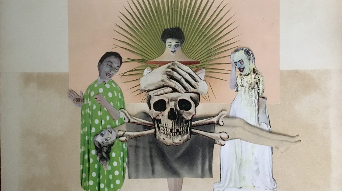 Faintly visible under some of the collages, is another ‘found’ material, further evidence if you like – children’s crayon doodling, struggling to make sense of a baffling adult universe, underlining the darkest and at the same time the most mundane aspect of this story. The murders were a group effort, with (it can’t be disproved) maybe the purest of motives: as Spiritualists the family was dispatching its victims into the glorious afterlife, where as spirits they would continue endlessly to evolve. Never mind the incest – it’s the strongest of god-fearing family values that are being upheld. (The family that prays together slays together?) These collages fastidiously constructed with a sureness of hand that Dr Frankenstein might envy bring murder triumphantly back – Hitchcock said it – into the home where it belongs.