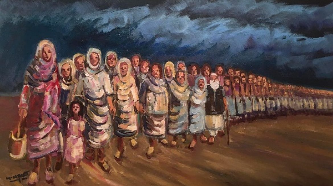 ‘My name is Azeez Nasser I am now in my 60s. ‘I was born in Keren, Eritrea and had my primary education there. By then, Eritrea was forcibly annexed and became the fourteenth province of Ethiopia. It was a time of persistent political and military turmoil. Extrajudicial killings of citizens- young and old, torture, extortions and years of curfews was the order of the day. It is within such a venomous environment that I passed my childhood and as such I was physically and emotionally impacted by it. My personality and outlook of life was shaped by that turbulent environment. Perhaps that is why I resorted to paint although I have never had formal art education until I left Eritrea. I have been painting since then and writing poems and most of my works seem to reflect life, people and nature’.