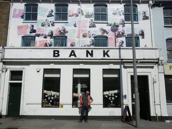 Former High Street Bank reinvented as a Bank producing new money and value. Community and cultural hub printing its own art/money and hosting events on the power of art to challenge and change the status quo.