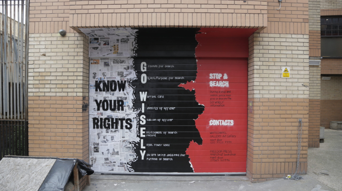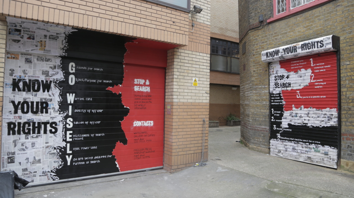 The Know Your Rights murals, designed by RESOLVE Collective, in collaboration with the Angel Allies, cover the rear shutters of Whitechapel Gallery and Freedom Press. The two murals provide essential information on citizens’ rights and police conduct for all users of the Alley. The Gallery’s shutter features the GOWISELY acronym, while the shutter on Freedom Press displays additional information from GOV.UK on police ‘stop and search’ powers, offering crucial guidance to those who may be unaware of their rights.