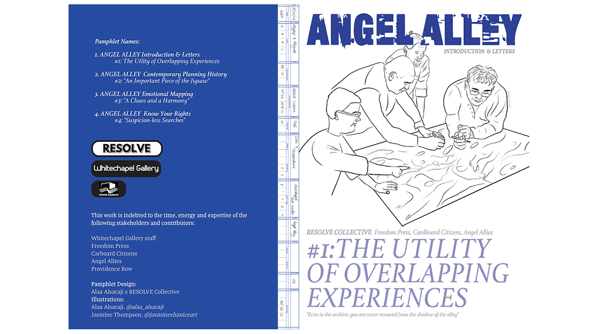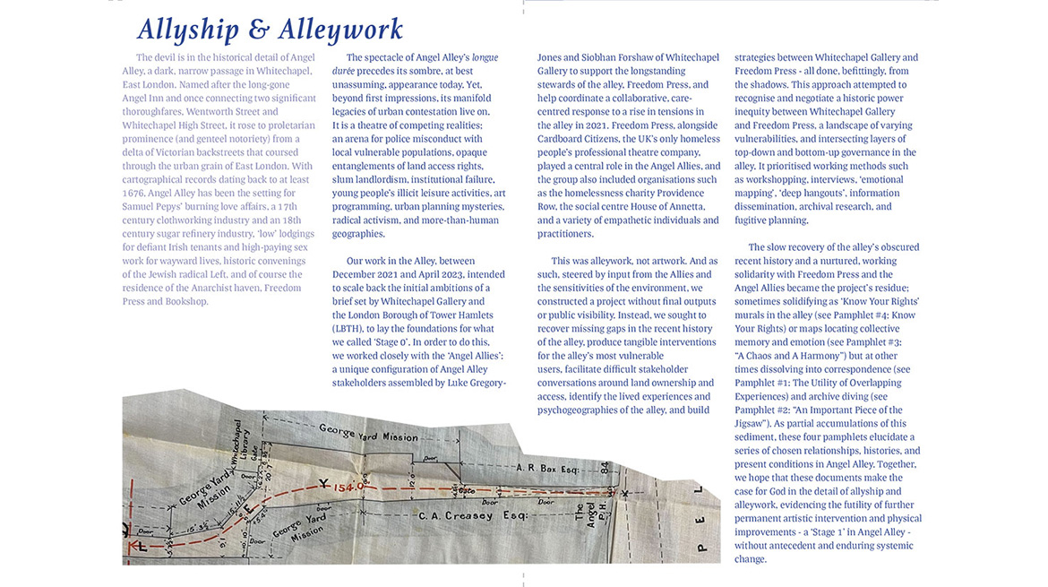 The slow recovery of the alley’s obscured recent history and a nurtured, working solidarity with Freedom Press and the Angel Allies became the project’s residue; sometimes solidifying as ‘Know Your Rights’ murals in the alley (see Pamphlet #4: Know Your Rights) or maps locating collective memory and emotion (see Pamphlet #3: “A Chaos and A Harmony”) but at other times dissolving into correspondence (see Pamphlet #1: The Utility of Overlapping Experiences) and archive diving (see Pamphlet #2: “An Important Piece of the Jigsaw”). As partial accumulations of this sediment, these four pamphlets elucidate a series of chosen relationships, histories, and present conditions in Angel Alley. Together, we hope that these documents make the case for God in the detail of allyship and alleywork, evidencing the futility of further permanent artistic intervention and physical improvements – a ‘Stage 1’ in Angel Alley – without antecedent and enduring systemic change.