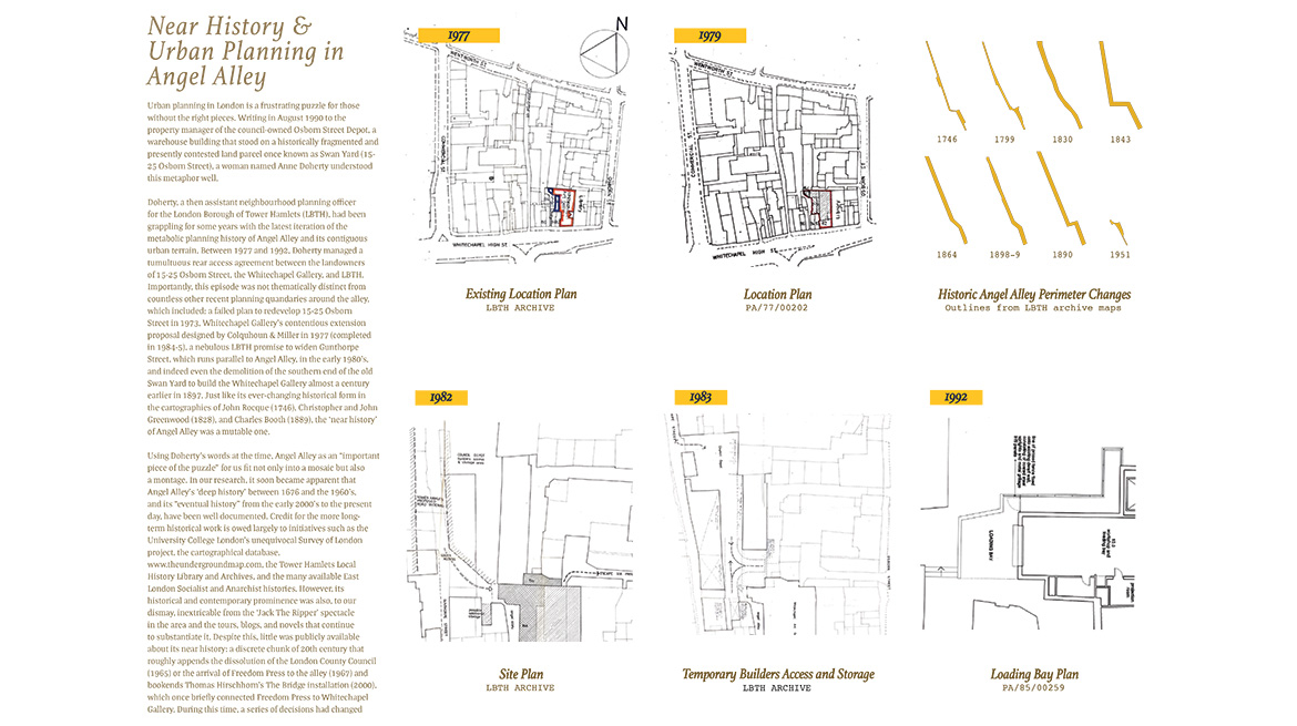 Doherty, a then assistant neighbourhood planning officer for the London Borough of Tower Hamlets (LBTH), had been grappling for some years with the latest iteration of the metabolic planning history of Angel Alley and its contiguous urban terrain. Between 1977 and 1992, Doherty managed a tumultuous rear access agreement between the landowners of 15-25 Osborn Street, the Whitechapel Gallery, and LBTH. Importantly, this episode was not thematically distinct from countless other recent planning quandaries around the alley, which included: a failed plan to redevelop 15-25 Osborn Street in 1973, Whitechapel Gallery’s contentious extension proposal designed by Colquhoun & Miller in 1977 (completed in 1984-5), a nebulous LBTH promise to widen Gunthorpe Street, which runs parallel to Angel Alley, in the early 1980’s, and indeed even the demolition of the southern end of the old Swan Yard to build the Whitechapel Gallery almost a century earlier in 1897. Just like its ever-changing historical form in the cartographies of John Rocque (1746), Christopher and John Greenwood (1828), and Charles Booth (1889), the ‘near history’ of Angel Alley was a mutable one.