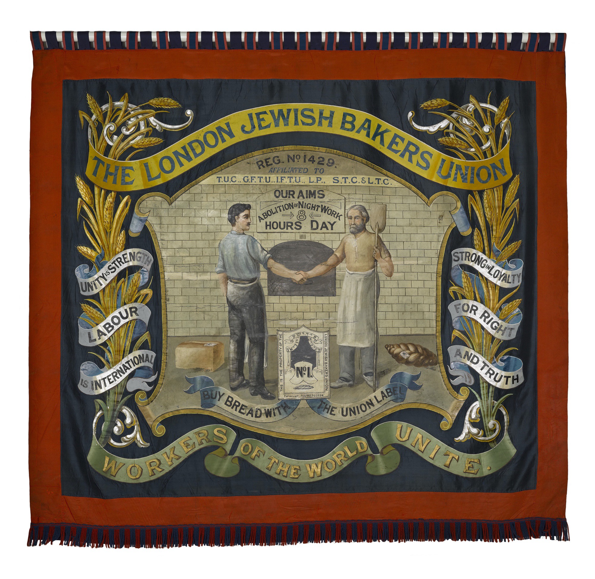 Depicted here is an image of a silk banner made in 1925, one of only two surviving Jewish Union banners in Britain. It belonged to the London Jewish Bakers’ Union, the longest-lived Jewish trade union from 1905 to 1970.