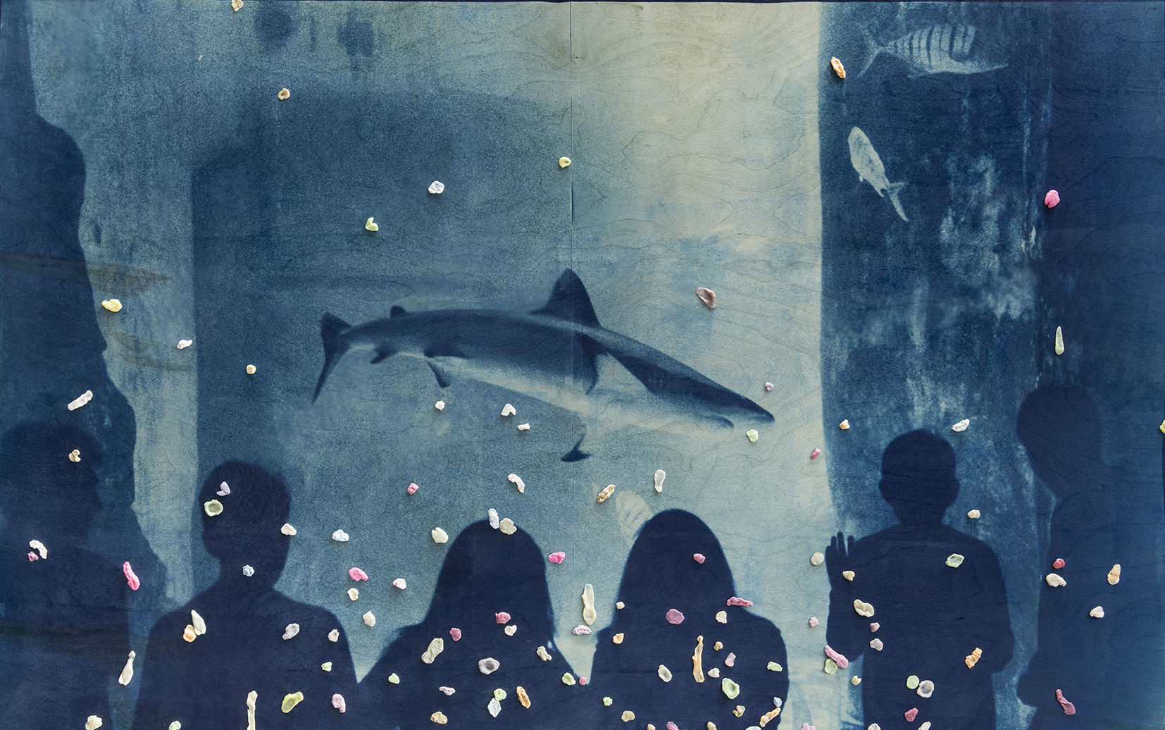 Patrick Goddard, Catacomb of Bones (detail), 2019, Cyanotype on wood with chewing gums.