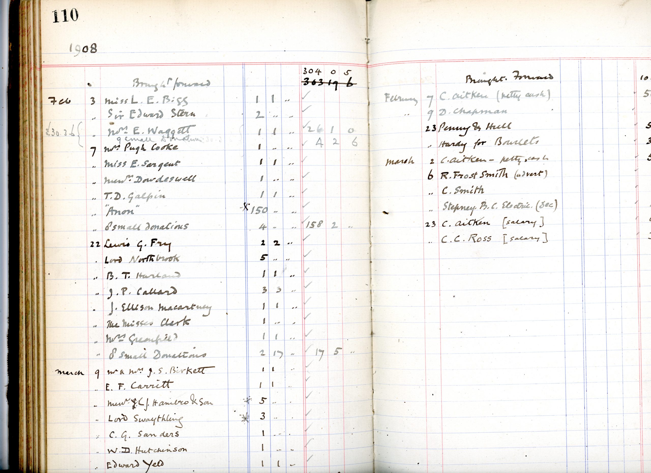Learn > Whitechapel Gallery Archive > Archive Holdings > Trustees > 1st Cashbook p110- 1908 – Continuity